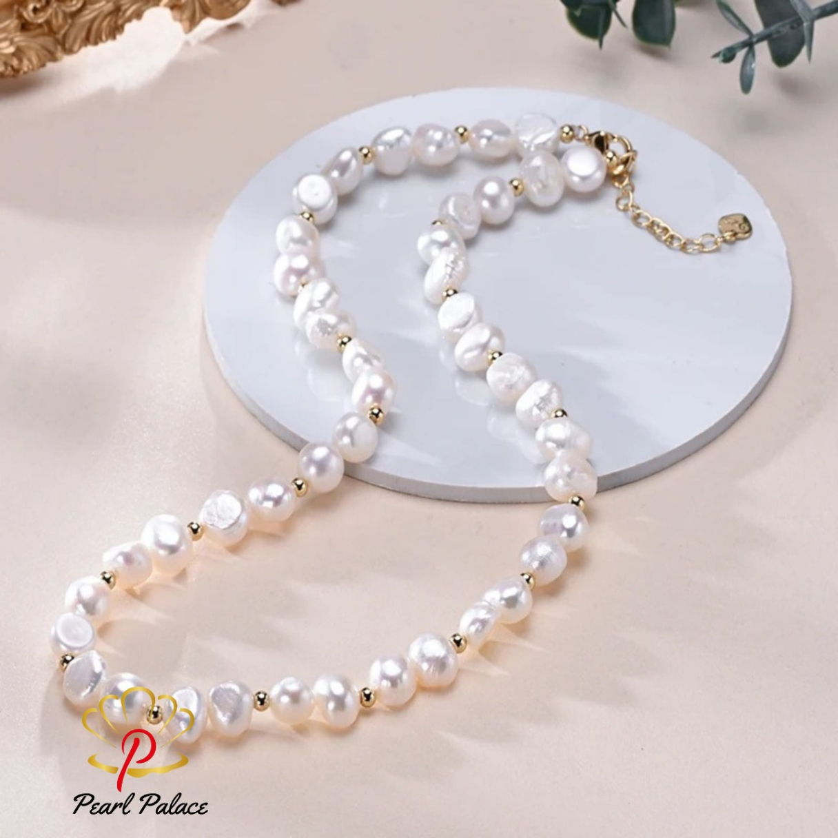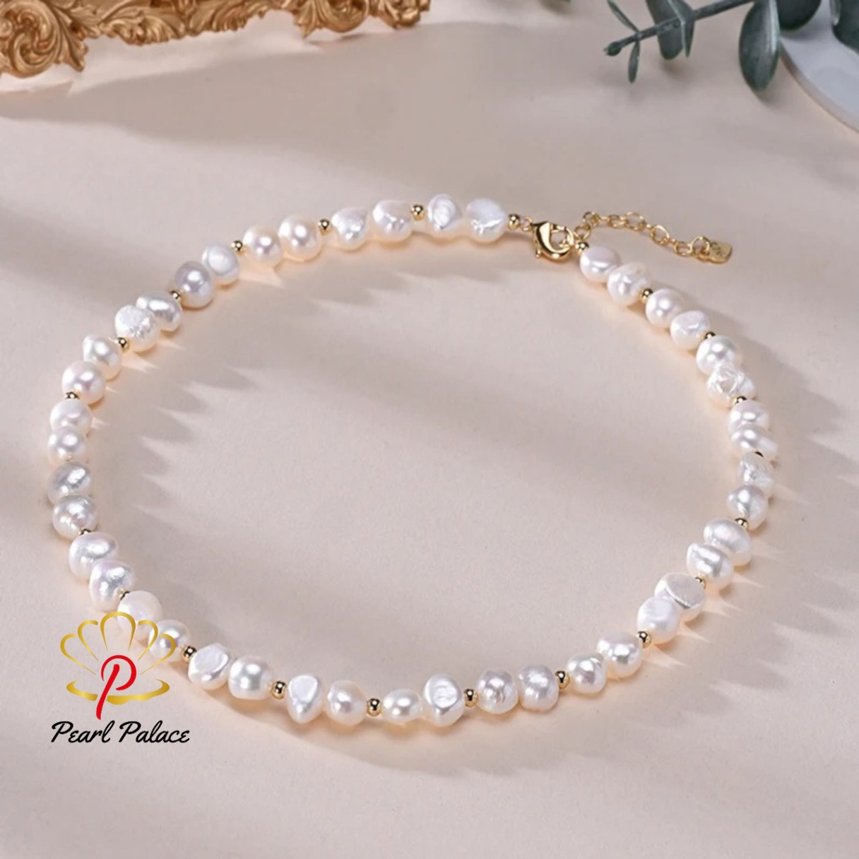 Product name: Baroque Freshwater 8-9mm White Pearl With Small Gold Bead Necklace 925 Sterling Silver Jewelry Pearl Size: 7-8 mm Pearl Grade: AAA Pearl Length 17-18 Inch.