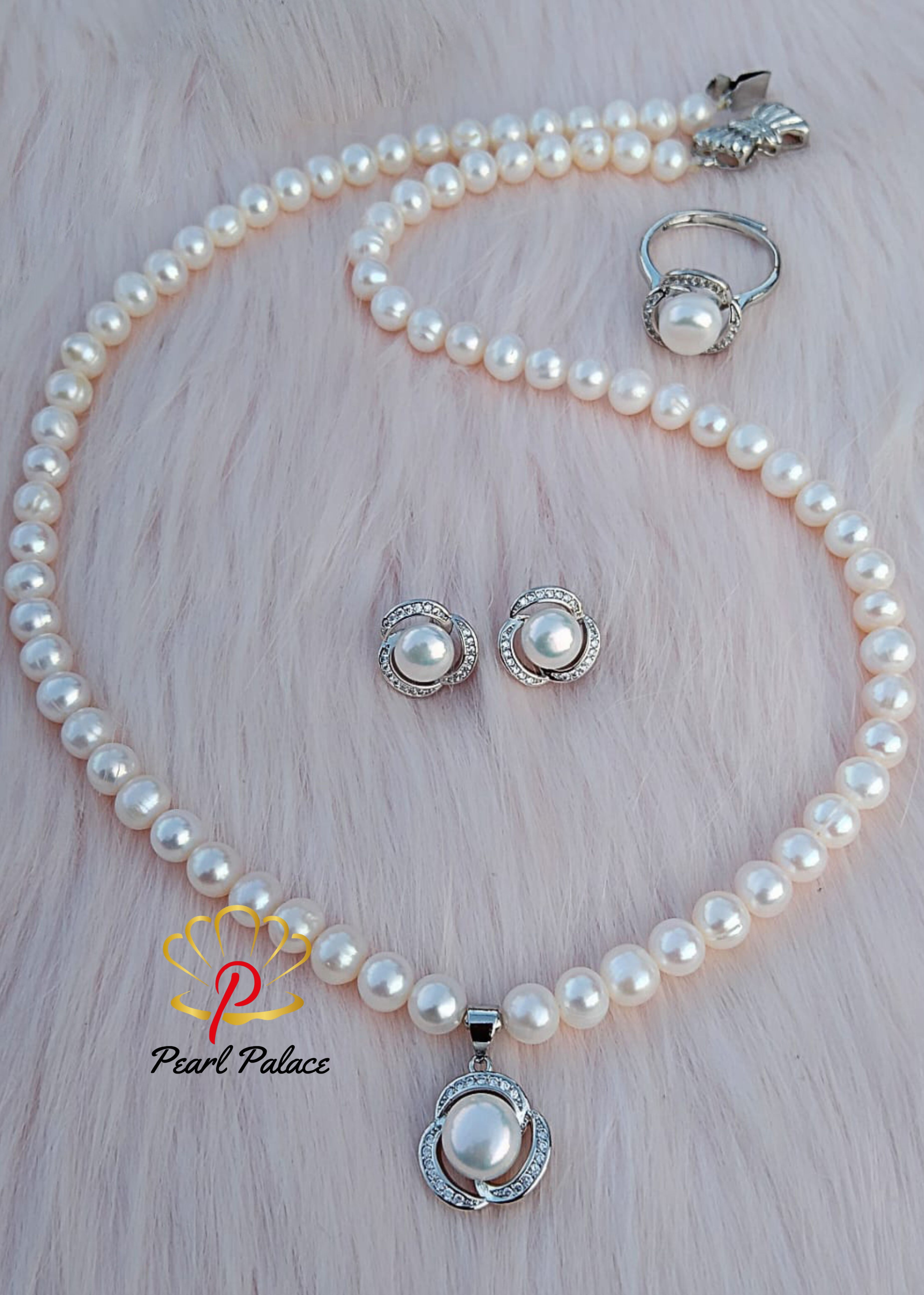 A classic statement of sophistication, this white pearl pendant set exudes timeless charm. The luminous pearls are perfectly complemented by dazzling silver embellishments, creating an exquisite balance of elegance and grace. Ideal for both formal and casual occasions, this set is a must-have for every jewelry collection.