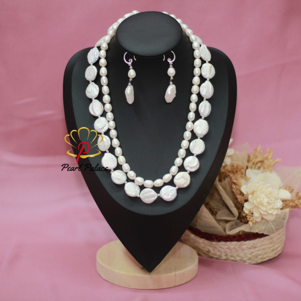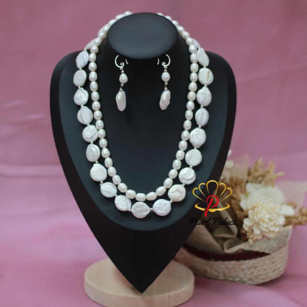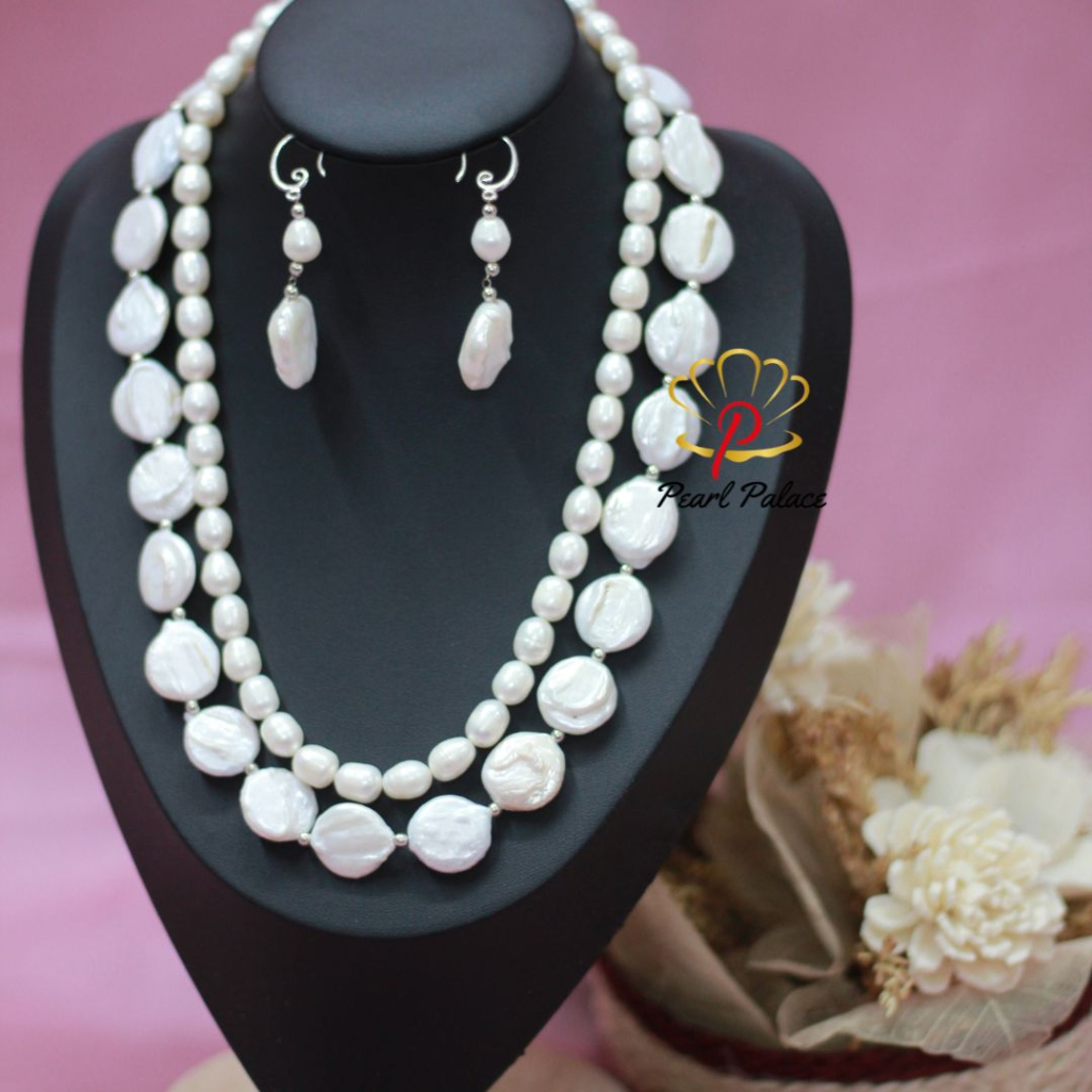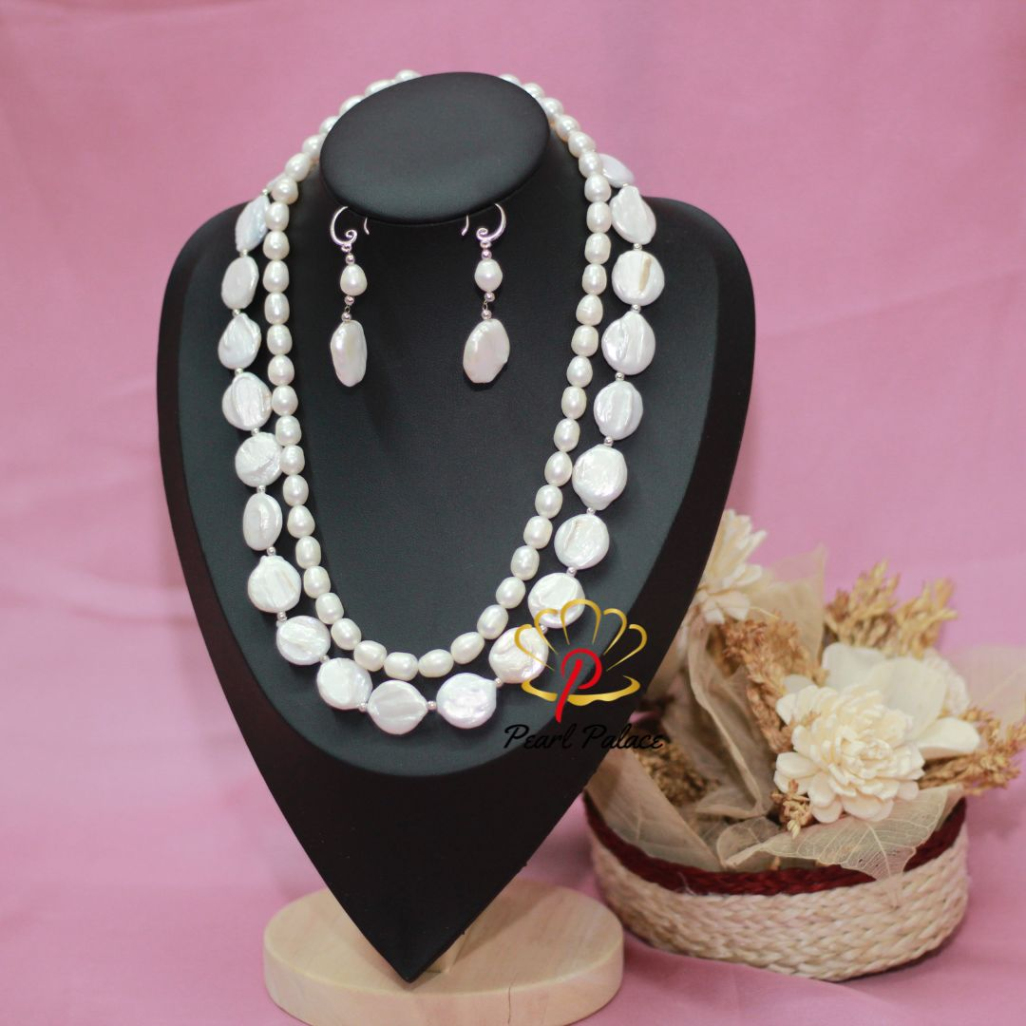 Product name: Elegant White Rice & Coin Pearl Necklace Set Pearl Size: 7-8 mm Pearl Grade: AAA Pearl Length 17-21 inch.