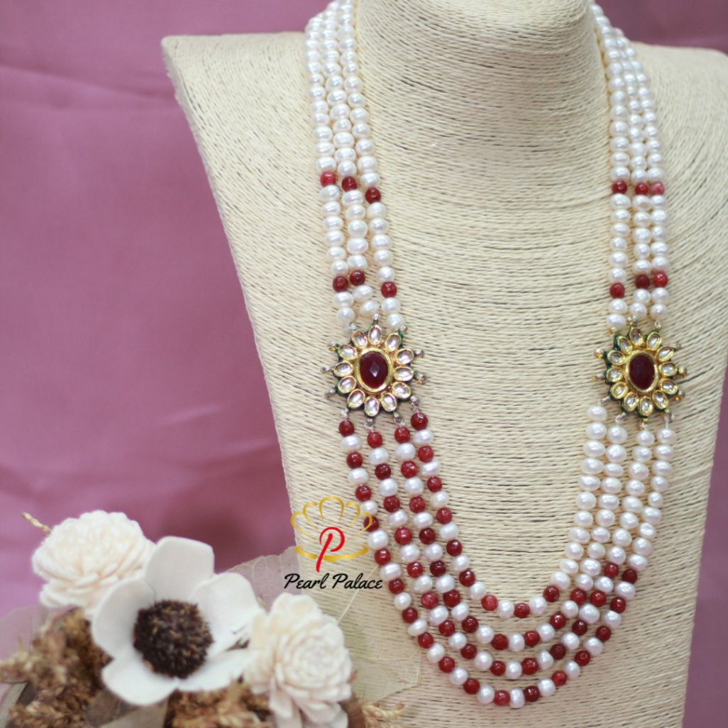 Exclusive Ruby & Pearl Men's Multi-Layer Wedding Necklace A regal and elegant necklace crafted for grooms, featuring premium white round pearls and exquisite ruby accents. Designed to complement sherwanis for a royal and sophisticated look.