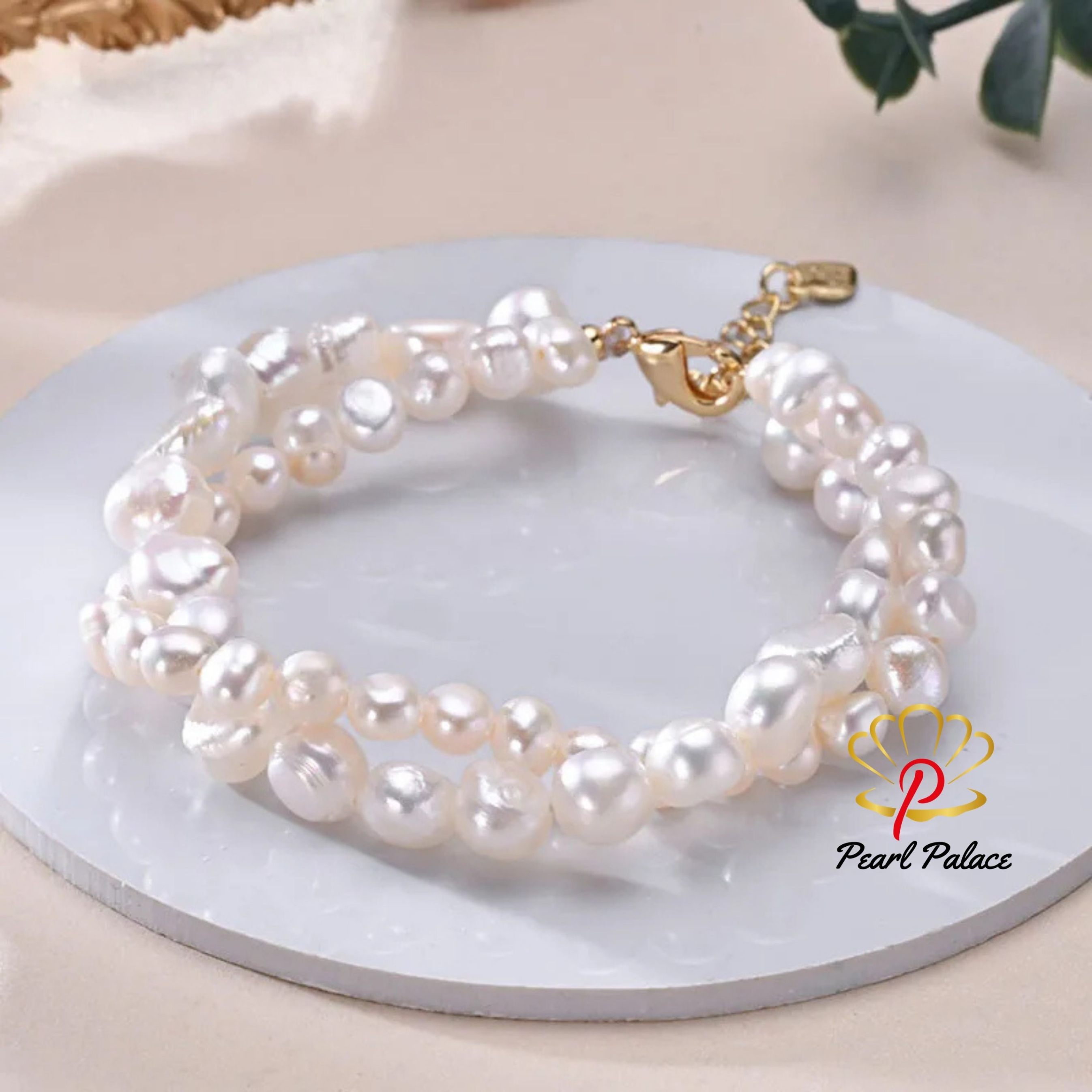 This elegant double-layered bracelet features baroque freshwater pearls in 5-6mm and 8-9mm sizes, creating a refined and distinctive look. Crafted with 925 sterling silver, it’s a perfect addition to any jewelry collection.