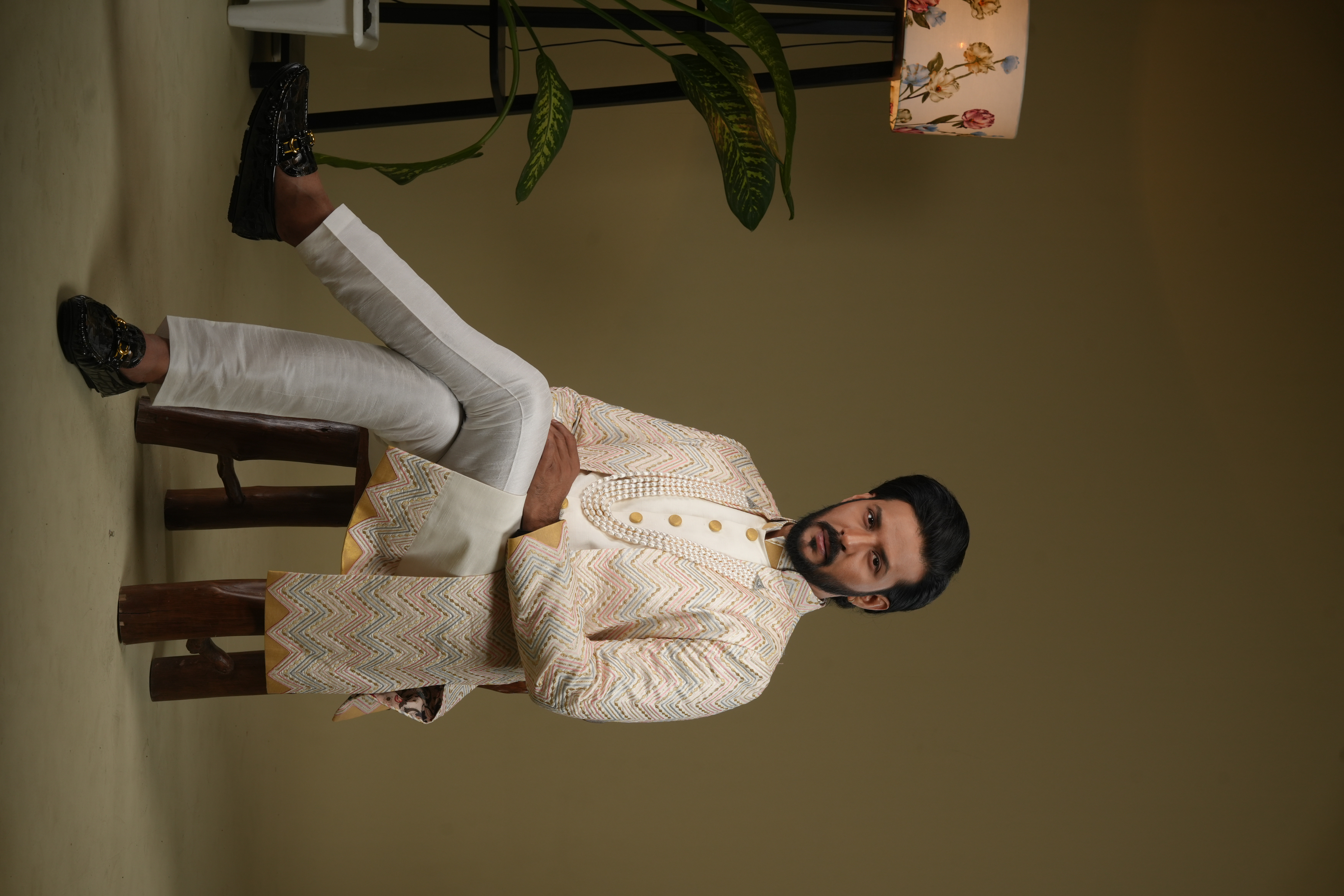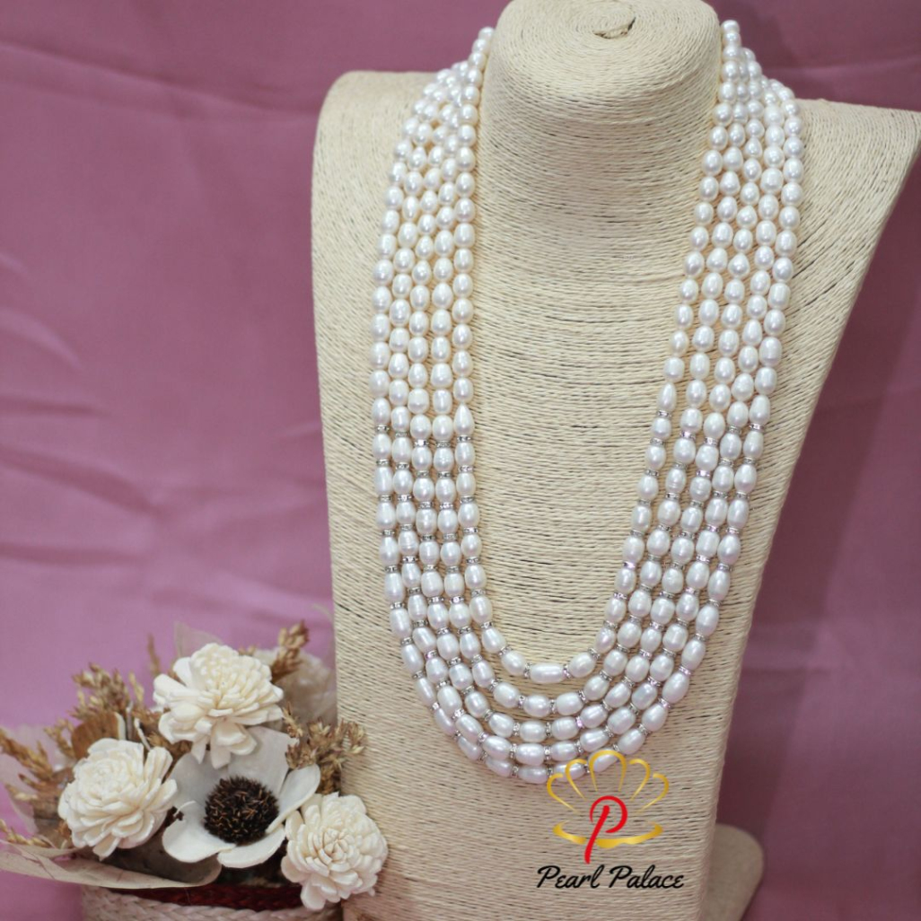 This distinguished 5-layer necklace is designed for men to wear with their sherwani at weddings. Featuring high-quality white rice pearls, it exudes elegance and complements traditional attire with a timeless, sophisticated look.