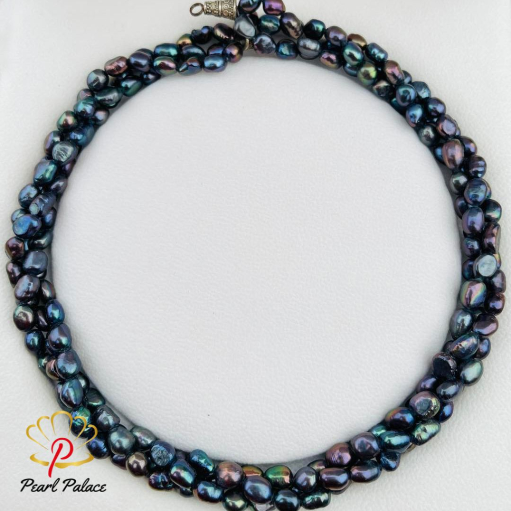 Short Description: A luxurious, multi-strand (3 layer) necklace featuring genuine freshwater pearls with a captivating peacock blue and black luster.